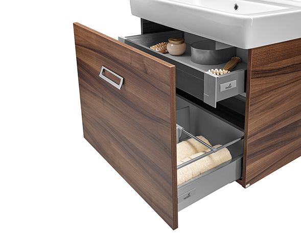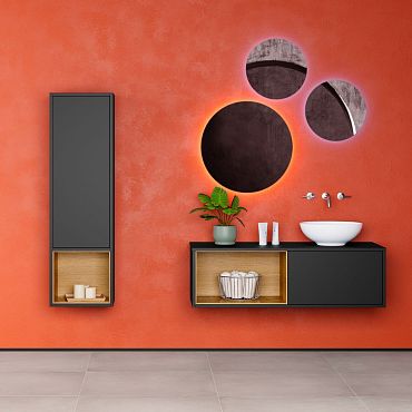 Kolekce Q mono jedinečně spojuje ostré s kulatým. Skutečně, přijďte se přesvědčit: i tato skříňka využívá elegantní oblosti kulaté hrany umyvadla a čisté ostré hrany boku skříňky.