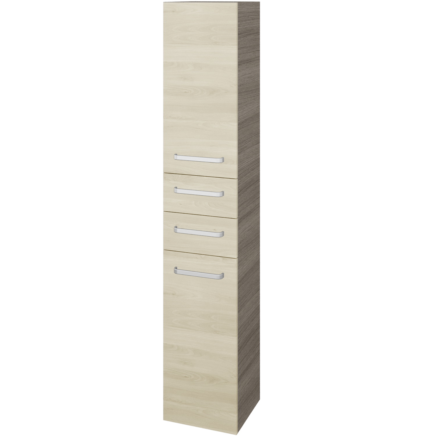 Závesná vysoká skriňa DOS SVD2Z2 35 má 2 veľké časti s policami a 2 zásuvky. Za dvierkami nájdete 4 výškovo polohovateľné sklenené police. Uprostred skrinky sú 2 zásuvky, ktoré sú svojou veľkosťou a prístupnosťou ideálne na uloženie každodenných maličkostí. Vysoká skriňa v kúpeľni predstavuje mnoho úložného priestoru. Smer otvárania dvierok skrinky si môžete zvoliť pri objednávke, rovnako ako úchytky, ktoré budú najlepšie sedieť k ďalšiemu vybaveniu kúpeľne.