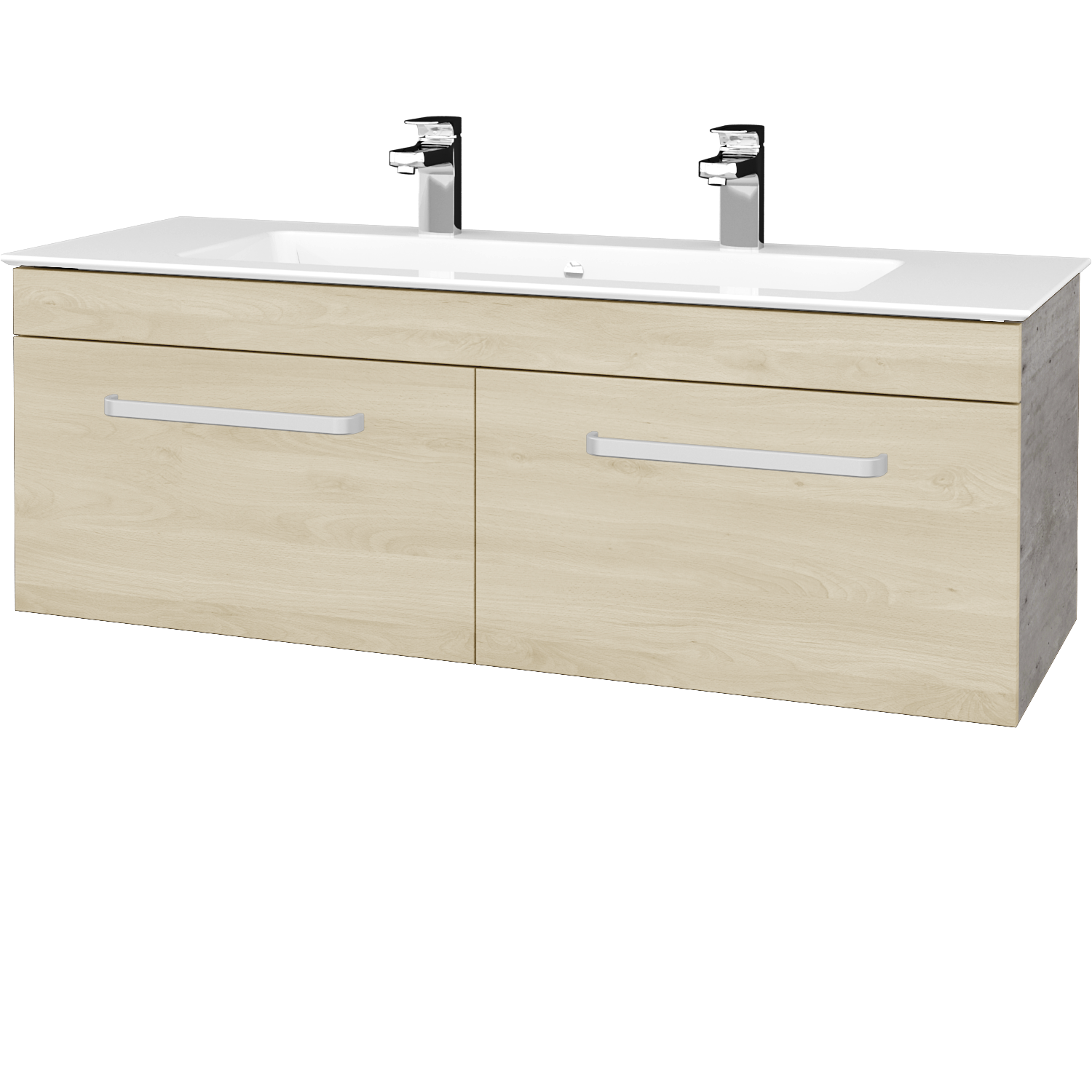 Prezrieť katalógUmývadlová skrinka (1200×420×445) s 2 zásuvkami a keramickým umývadlom Pura 120 s 2 otvormi na batériu Zobraziť viac