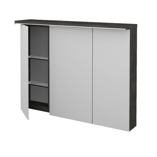 Trojdverová zrkadlová skrinka ASTON GAO3E 100 je ideálnym riešením pre veľké kúpeľne a viacčlenné domácnosti, kde je kladený veľký dôraz na úložný priestor a dostatok zrkadlovej plochy. Obojstranne zrkadlové dvierka zaisťujú pohodlné používanie pre každého člena domácnosti, a to aj počas rannej špičky. Dvierka sa otvárajú za spodný presah a ku korpusu galérky sú prichytené pomocou našej špeciálnej patentovanej lišty a značkového kovania Hettich, ktoré dvierkam zaisťuje pohodlné a tlmené dovieranie.