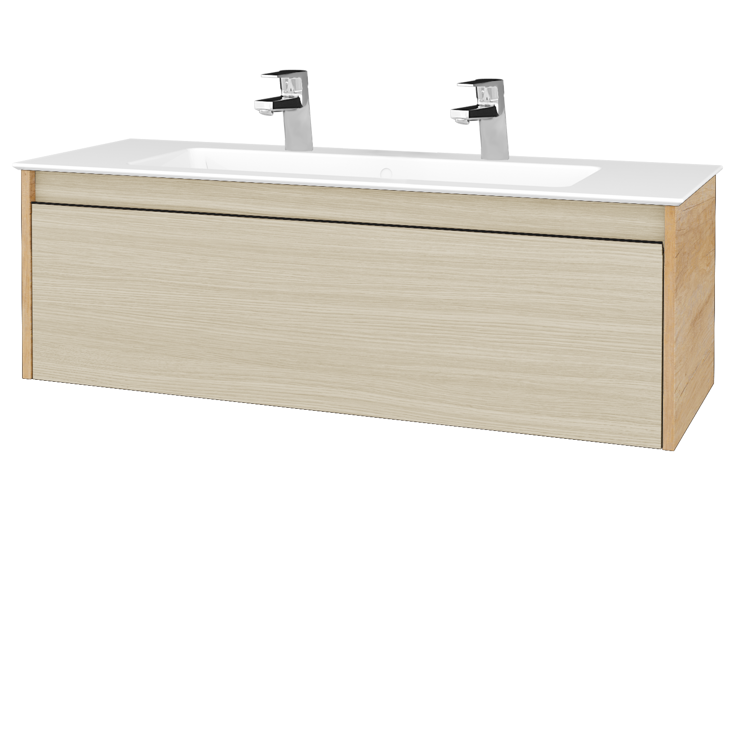 Prezrieť katalógZávesná umývadlová skrinka (1200x390x445) s 1 zásuvkou a keramickým umývadlom Pura 120 s 2 otvormi pre batériu Zobraziť viac