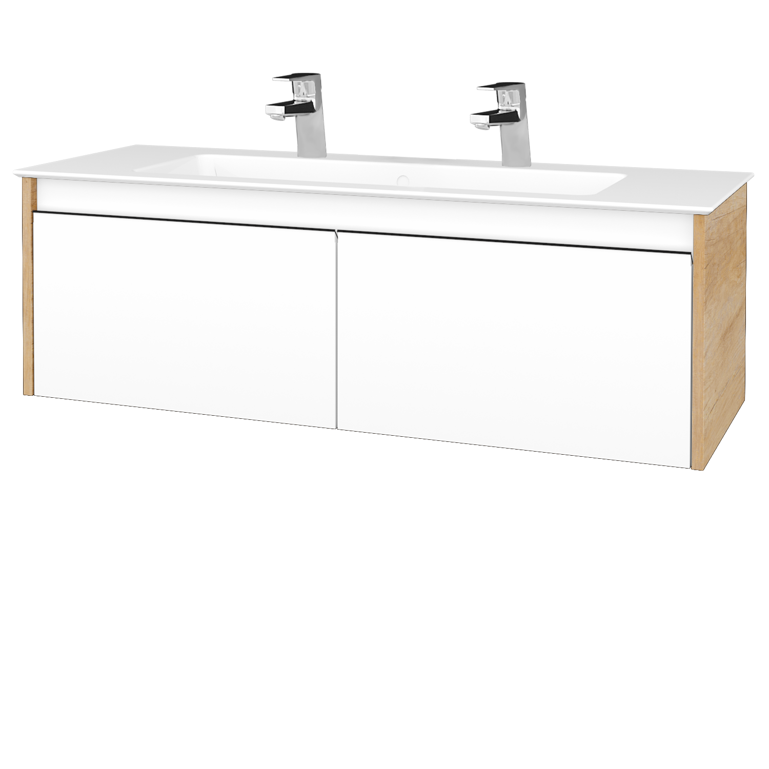 Závesná umývadlová skrinka (1200x390x445) s 2 zásuvkami a keramickým umývadlom Pura 120 s 2 otvormi…