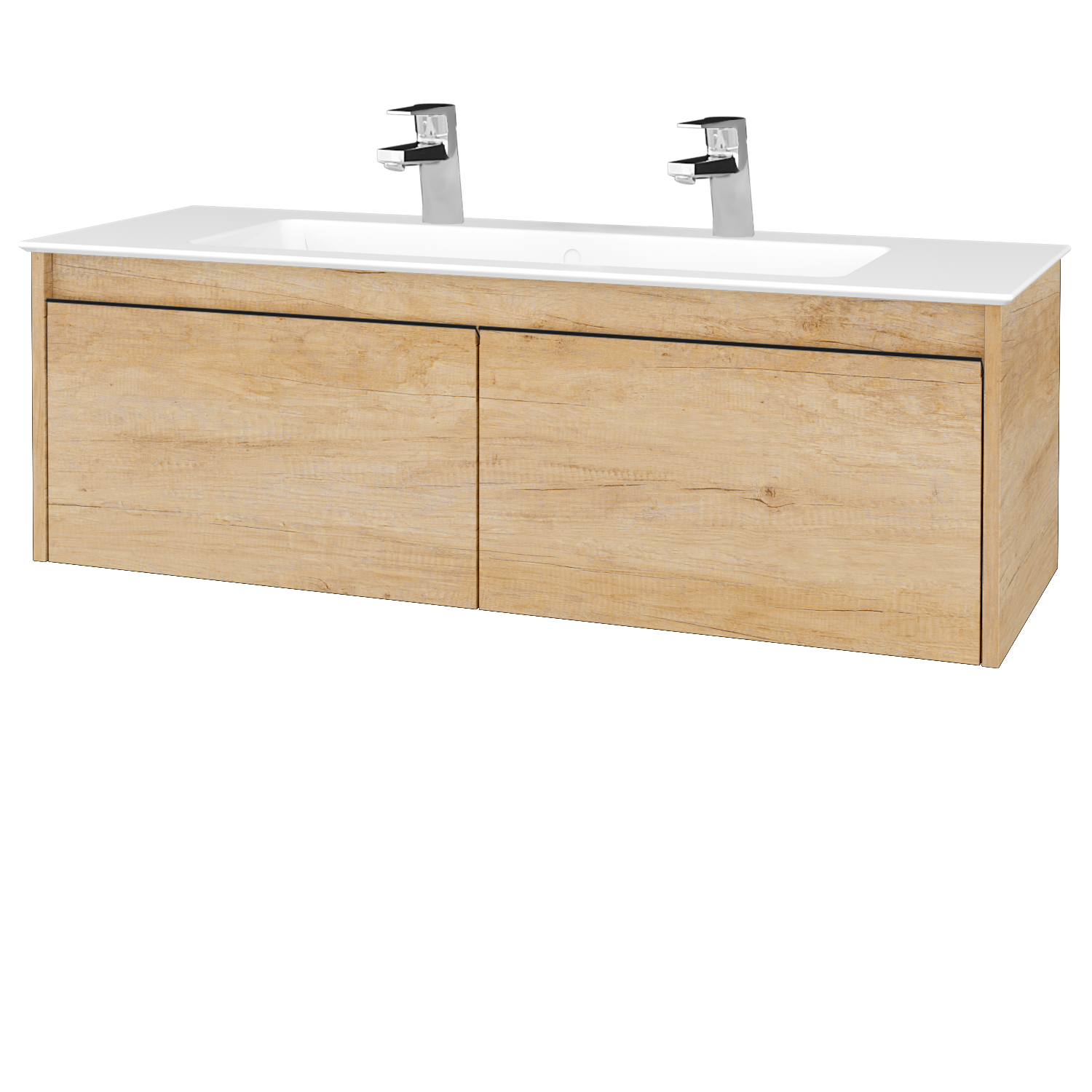 Prezrieť katalógZávesná umývadlová skrinka (1200x390x445) s 2 zásuvkami a keramickým umývadlom Pura 120 s 2 otvormi pre batériu Zobraziť viac