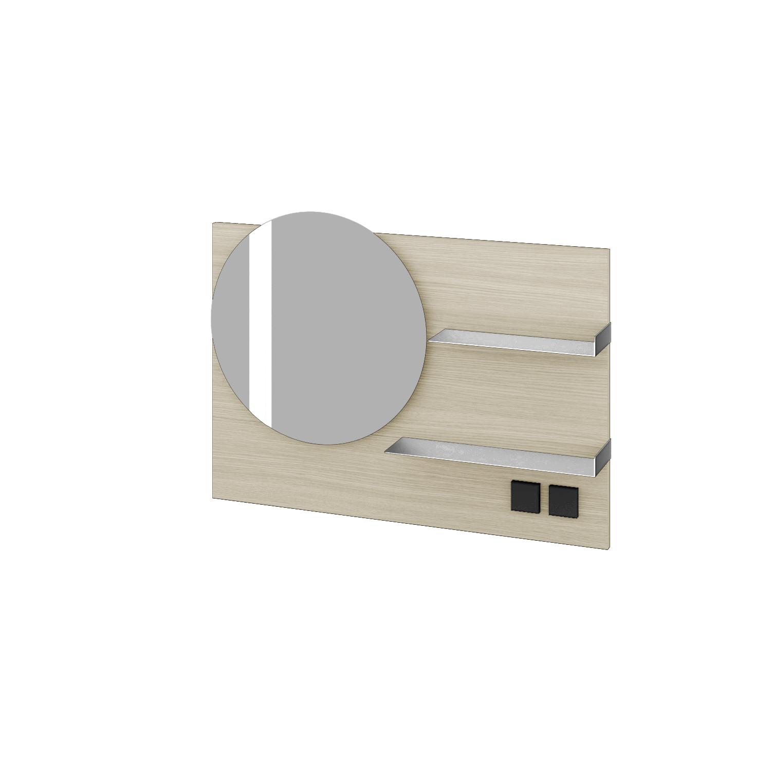 Prezrieť katalógOkrúhle zrkadlo na obdĺžnikovej doske s integrovaným LED osvetlením o výkone 58 W, vypínačom, zásuvkou a dvojicou plechových políc Zobraziť viac