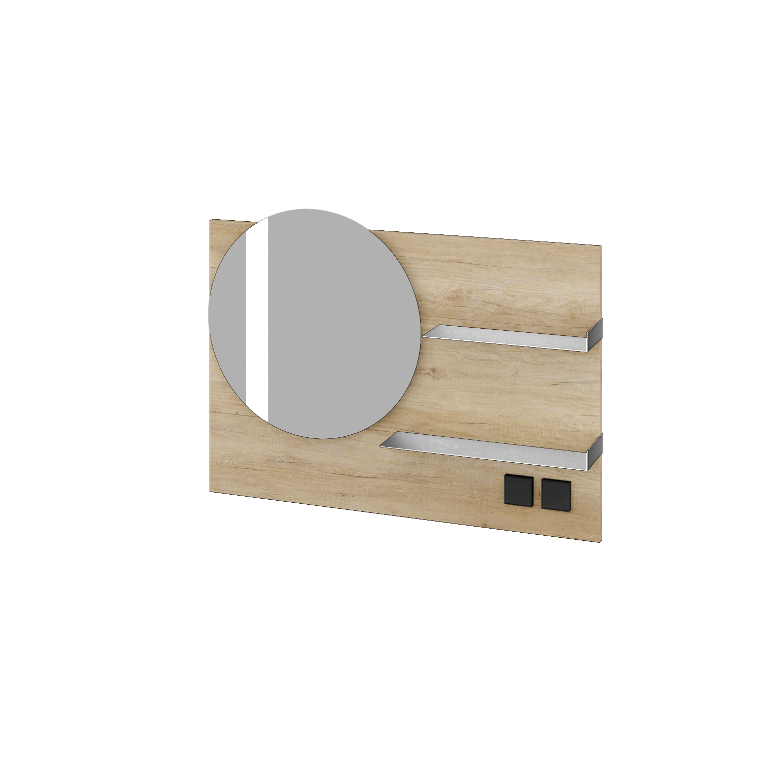 Prezrieť katalógOkrúhle zrkadlo na obdĺžnikovej doske s integrovaným LED osvetlením o výkone 58 W, vypínačom, zásuvkou a dvojicou plechových políc Zobraziť viac