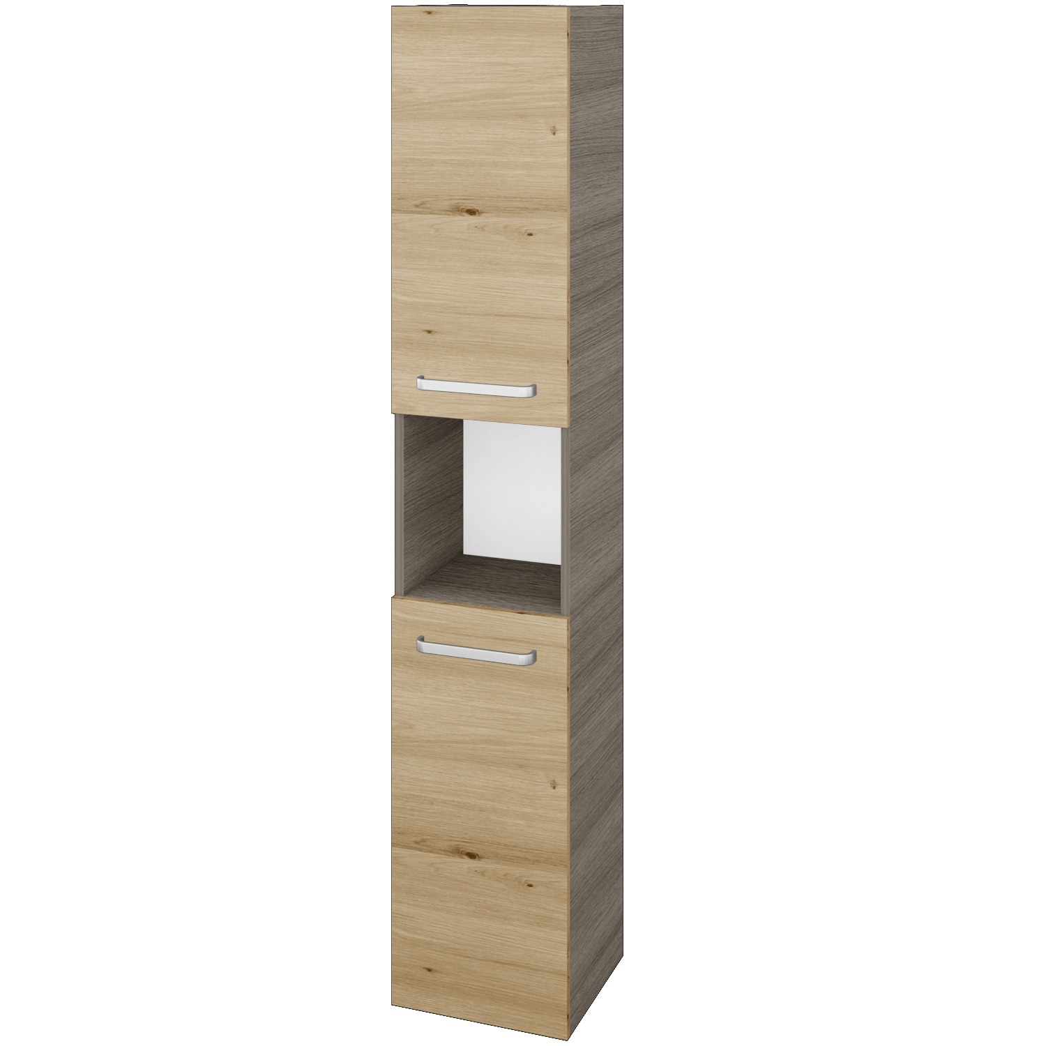 Závesná vysoká skriňa DOS SVD2O 35 je rozdelená na polovicu praktickou nikou uprostred, ktorú využijete na každodenné drobnosti alebo malú dekoráciu. V každej časti za dvierkami nájdete 2 výškovo polohovateľné sklenené police. Vysoká skriňa v kúpeľni predstavuje mnoho úložného priestoru. Smer otvárania dvierok skrinky si môžete zvoliť pri objednávke. Na dvierka si môžete vybrať z niekoľkých úchytiek v rôznych dizajnoch alebo zvoliť bezúchytkový variant otvárania Push-to-open.