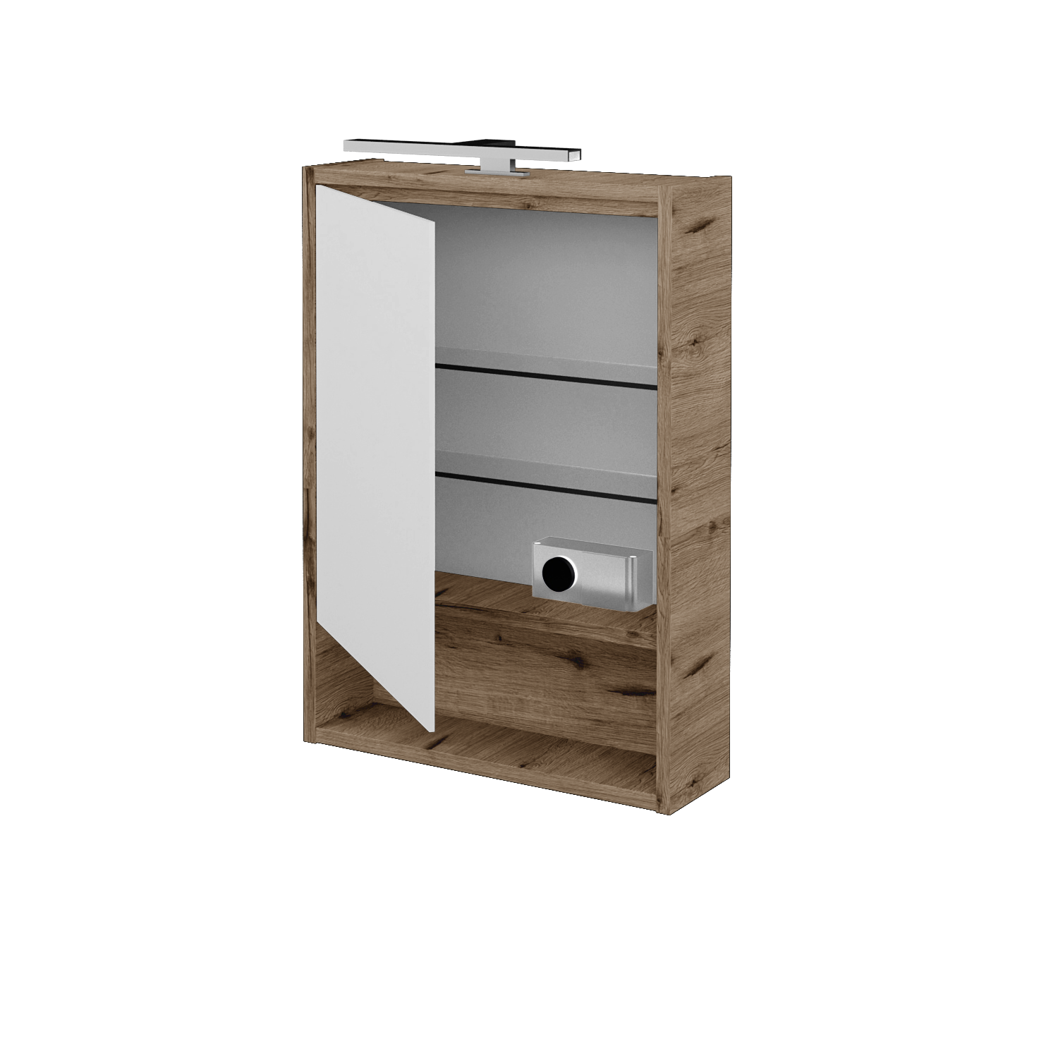 Externé LED osvetlenie PINO 300 (5 W) sa ovláda pomocou vypínača vo vnútri skrinky. Okrem toho tam nájdete aj elektrickú zásuvku, vďaka ktorej bude úprava vlasov a brady o niečo pohodlnejšia. Galérka spĺňa krytie IP 44. V celkovej cene je zahrnuté LED osvetlenie aj zásuvka.