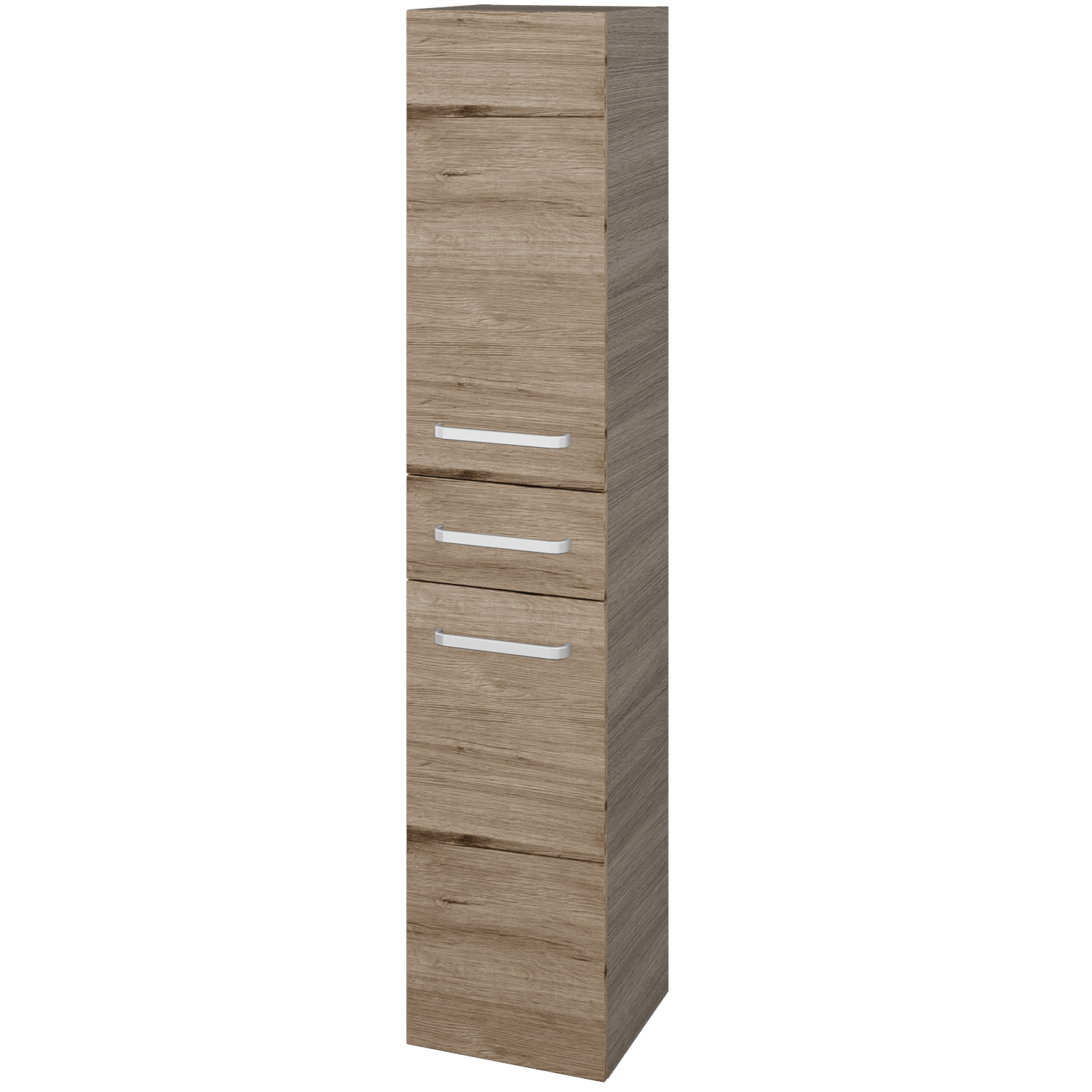 Priestranná vysoká skriňa DOS SVD2ZK 35 prinesie do vašej kúpeľne rázom poriadok. Má totiž vyhranený úložný priestor na všetko! Za dvierkami v hornej časti sa nachádzajú 2 sklenené, výškovo polohovateľné police. Jednoducho si tak upravíte toto miesto podľa výšky čistiacich prostriedkov, množstva čistých uterákov alebo ďalších predmetov. Orientáciu dvierok (vpravo/vľavo) vám radi pripravíme podľa dispozícií kúpeľne. Skvele prístupná zásuvka uprostred skrine je ideálna na drobnejšie predmety, napríklad kozmetiku alebo lieky, ktoré chcete mať po ruke, ale vo veľkom priestore by sa ľahko stratili. A spodná časť skrine za výklopnými dvierkami ukrýva kôš na bielizeň. Ten navyše môžete jednoducho vybrať a presunúť bližšie k práčke. Táto vysoká skriňa tak rieši mnoho problémov naraz a navyše si môžete vybrať z mnohých úchytiek, aby ste ju ľahko zladili s ďalším kúpeľňovým nábytkom.