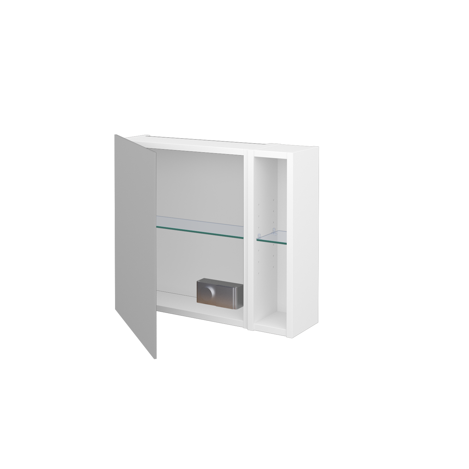 Prezrieť katalógJednodverová zrkadlová skrinka (600x530x163) s nikou vpravo a 2 sklenenými policami, vypínačom a zásuvkou Zobraziť viac
