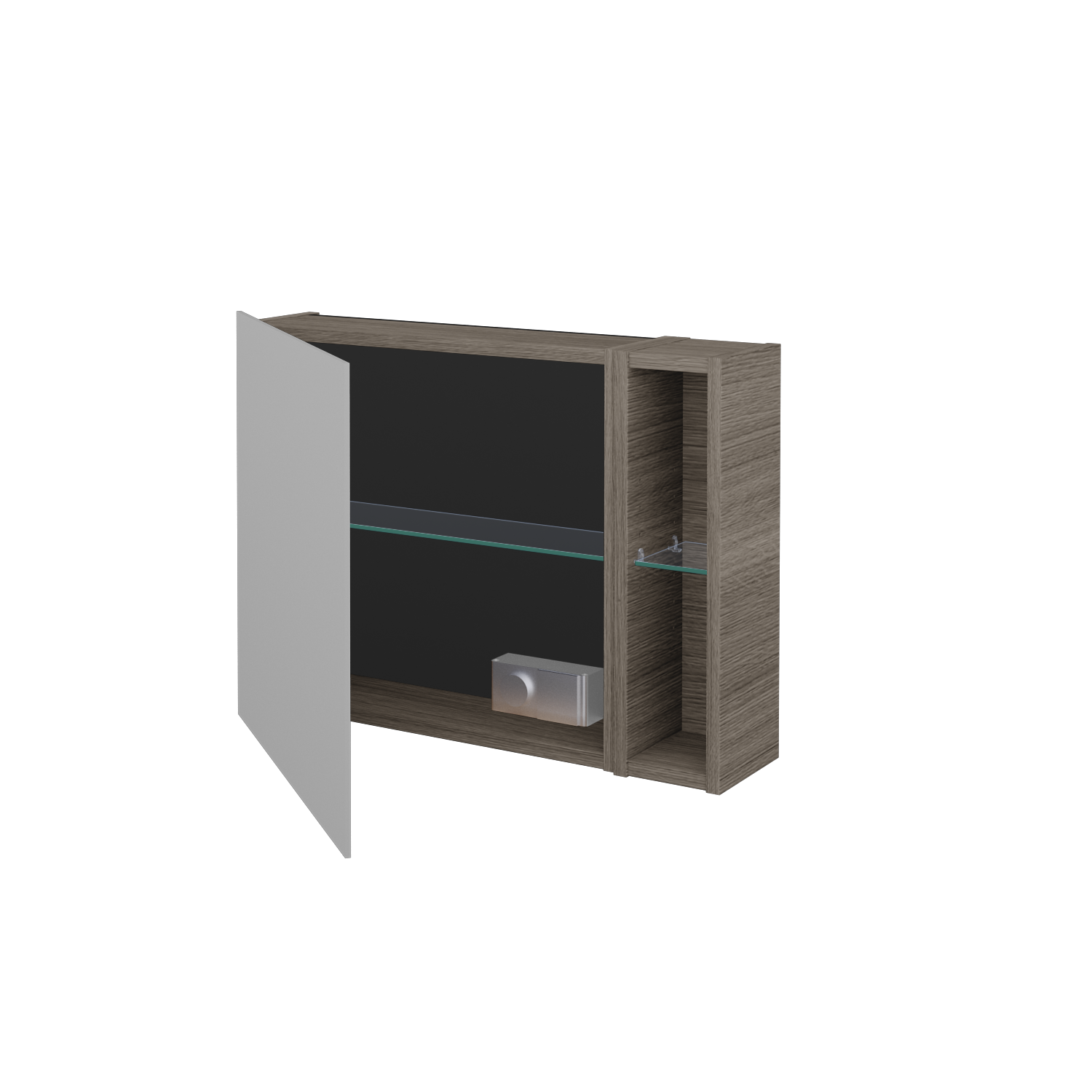 Prezrieť katalógJednodverová zrkadlová skrinka (700x530x163) s nikou vpravo a 2 sklenenými policami, vypínačom a zásuvkou Zobraziť viac