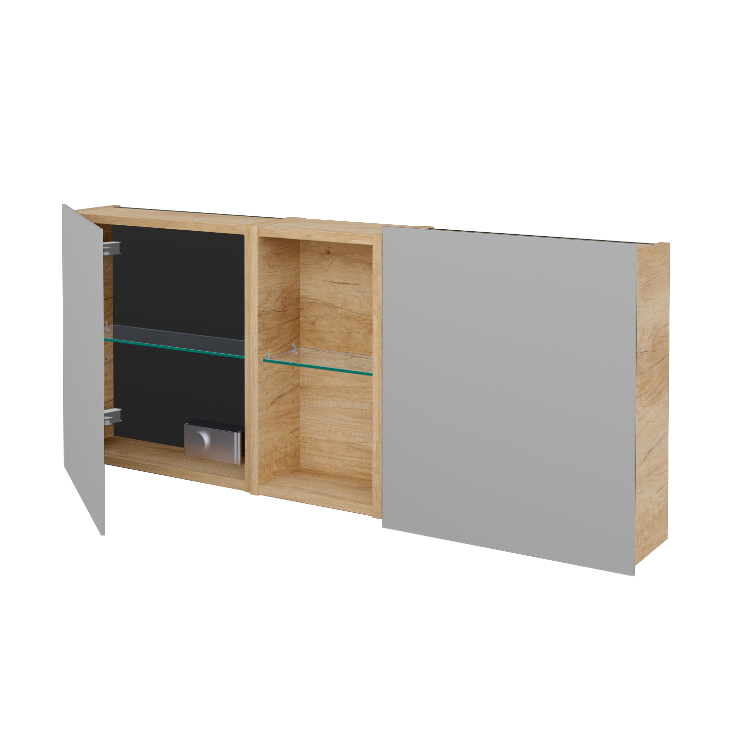 Po stranách niky nájdete priestor s obojstrannými zrkadlovými dvierkami, ktoré sa pohodlne otvárajú za spodný presah. Dvierka sú uchytené pomocou našej patentovanej lišty a osadené pántmi Hettich s tlmeným dovieraním, na ktoré výrobca poskytuje doživotnú záruku. V každej z troch častí je umiestnená jedna sklenená polica, takže usporiadanie je prehľadné a vyvážené. V uzavretých častiach sa navyše nachádza zásuvka a vypínač pre externé osvetlenie, pričom celé vyhotovenie spĺňa krytie IP44, takže je bezpečné aj v prostredí s vysokou vlhkosťou.
