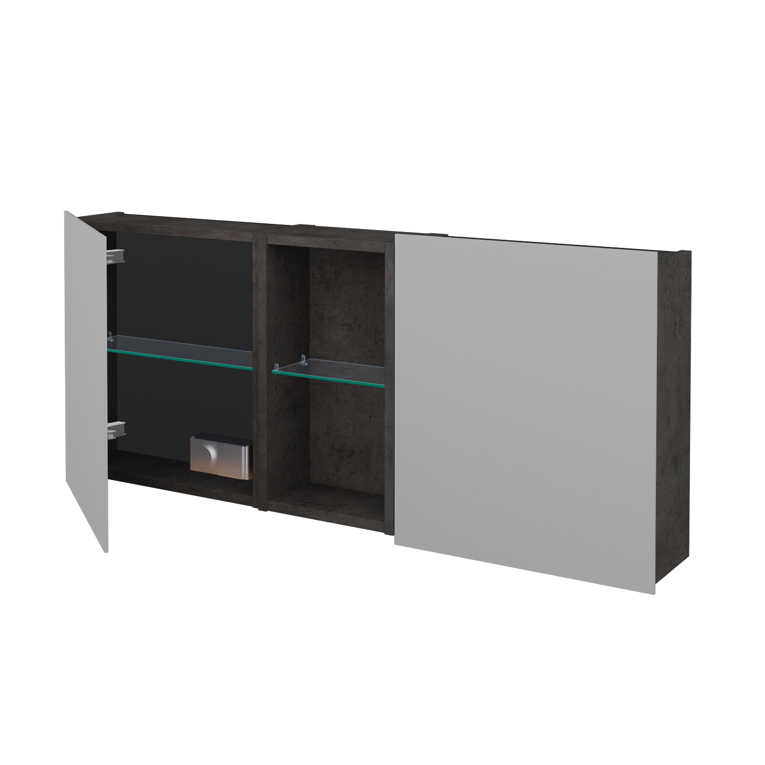 Po stranách niky nájdete priestor s obojstrannými zrkadlovými dvierkami, ktoré sa pohodlne otvárajú za spodný presah. Dvierka sú uchytené pomocou našej patentovanej lišty a osadené pántmi Hettich s tlmeným dovieraním, na ktoré výrobca poskytuje doživotnú záruku. V každej z troch častí je umiestnená jedna sklenená polica, takže usporiadanie je prehľadné a vyvážené. V uzavretých častiach sa navyše nachádza zásuvka a vypínač pre externé osvetlenie, pričom celé vyhotovenie spĺňa krytie IP44, takže je bezpečné aj v prostredí s vysokou vlhkosťou.