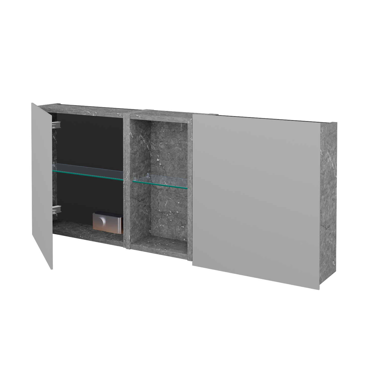 Prezrieť katalógDvojdverová zrkadlová skrinka (1200x530x163) s nikou uprostred a 3 sklenenými policami, vypínačom a zásuvkou Zobraziť viac