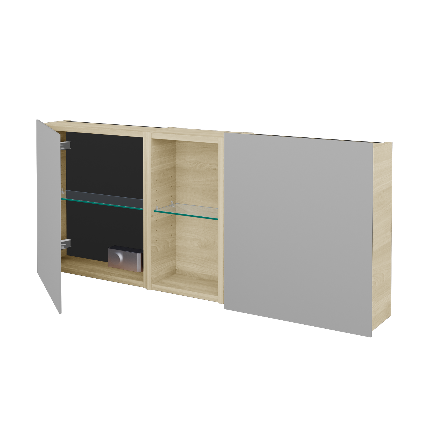 Po stranách niky nájdete priestor s obojstrannými zrkadlovými dvierkami, ktoré sa pohodlne otvárajú za spodný presah. Dvierka sú uchytené pomocou našej patentovanej lišty a osadené pántmi Hettich s tlmeným dovieraním, na ktoré výrobca poskytuje doživotnú záruku. V každej z troch častí je umiestnená jedna sklenená polica, takže usporiadanie je prehľadné a vyvážené. V uzavretých častiach sa navyše nachádza zásuvka a vypínač pre externé osvetlenie, pričom celé vyhotovenie spĺňa krytie IP44, takže je bezpečné aj v prostredí s vysokou vlhkosťou.