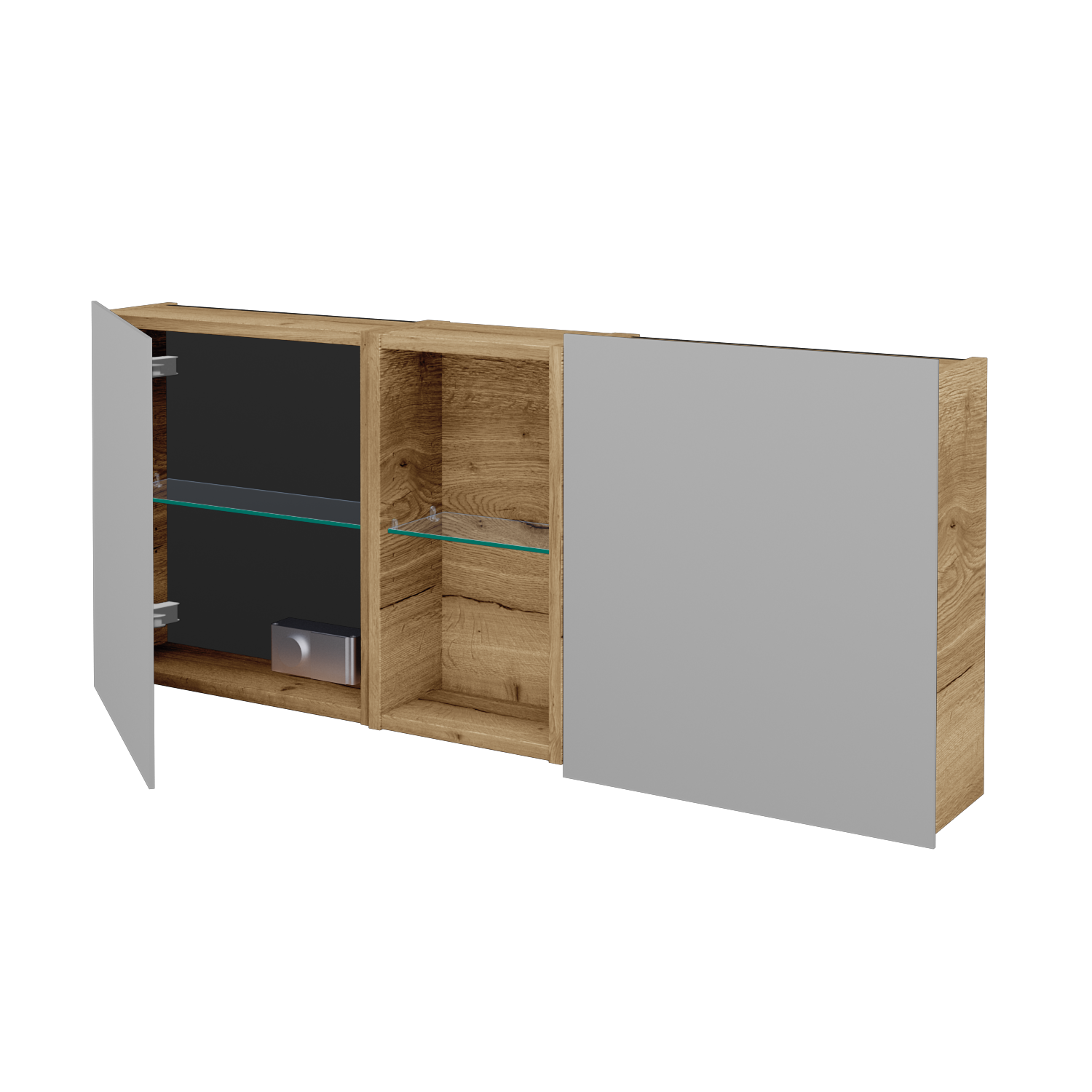 Po stranách niky nájdete priestor s obojstrannými zrkadlovými dvierkami, ktoré sa pohodlne otvárajú za spodný presah. Dvierka sú uchytené pomocou našej patentovanej lišty a osadené pántmi Hettich s tlmeným dovieraním, na ktoré výrobca poskytuje doživotnú záruku. V každej z troch častí je umiestnená jedna sklenená polica, takže usporiadanie je prehľadné a vyvážené. V uzavretých častiach sa navyše nachádza zásuvka a vypínač pre externé osvetlenie, pričom celé vyhotovenie spĺňa krytie IP44, takže je bezpečné aj v prostredí s vysokou vlhkosťou.
