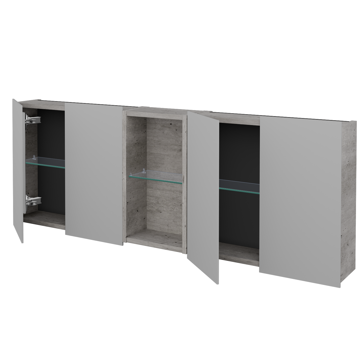 Po stranách niky nájdete priestor s obojstrannými zrkadlovými dvierkami, ktoré sa pohodlne otvárajú za spodný presah. Dvierka sú uchytené pomocou našej patentovanej lišty a osadené pántmi Hettich s tlmeným dovieraním, na ktoré výrobca poskytuje doživotnú záruku. V každej z troch častí je umiestnená jedna sklenená polica, takže usporiadanie je prehľadné a vyvážené. V uzavretých častiach sa navyše nachádza zásuvka a vypínač pre externé osvetlenie, pričom celé vyhotovenie spĺňa krytie IP44, takže je bezpečné aj v prostredí s vysokou vlhkosťou.