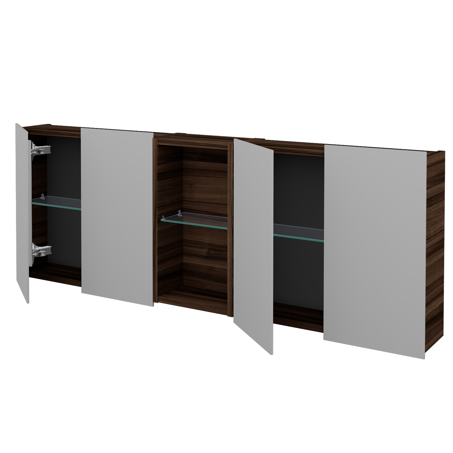 Po stranách niky nájdete priestor s obojstrannými zrkadlovými dvierkami, ktoré sa pohodlne otvárajú za spodný presah. Dvierka sú uchytené pomocou našej patentovanej lišty a osadené pántmi Hettich s tlmeným dovieraním, na ktoré výrobca poskytuje doživotnú záruku. V každej z troch častí je umiestnená jedna sklenená polica, takže usporiadanie je prehľadné a vyvážené. V uzavretých častiach sa navyše nachádza zásuvka a vypínač pre externé osvetlenie, pričom celé vyhotovenie spĺňa krytie IP44, takže je bezpečné aj v prostredí s vysokou vlhkosťou.