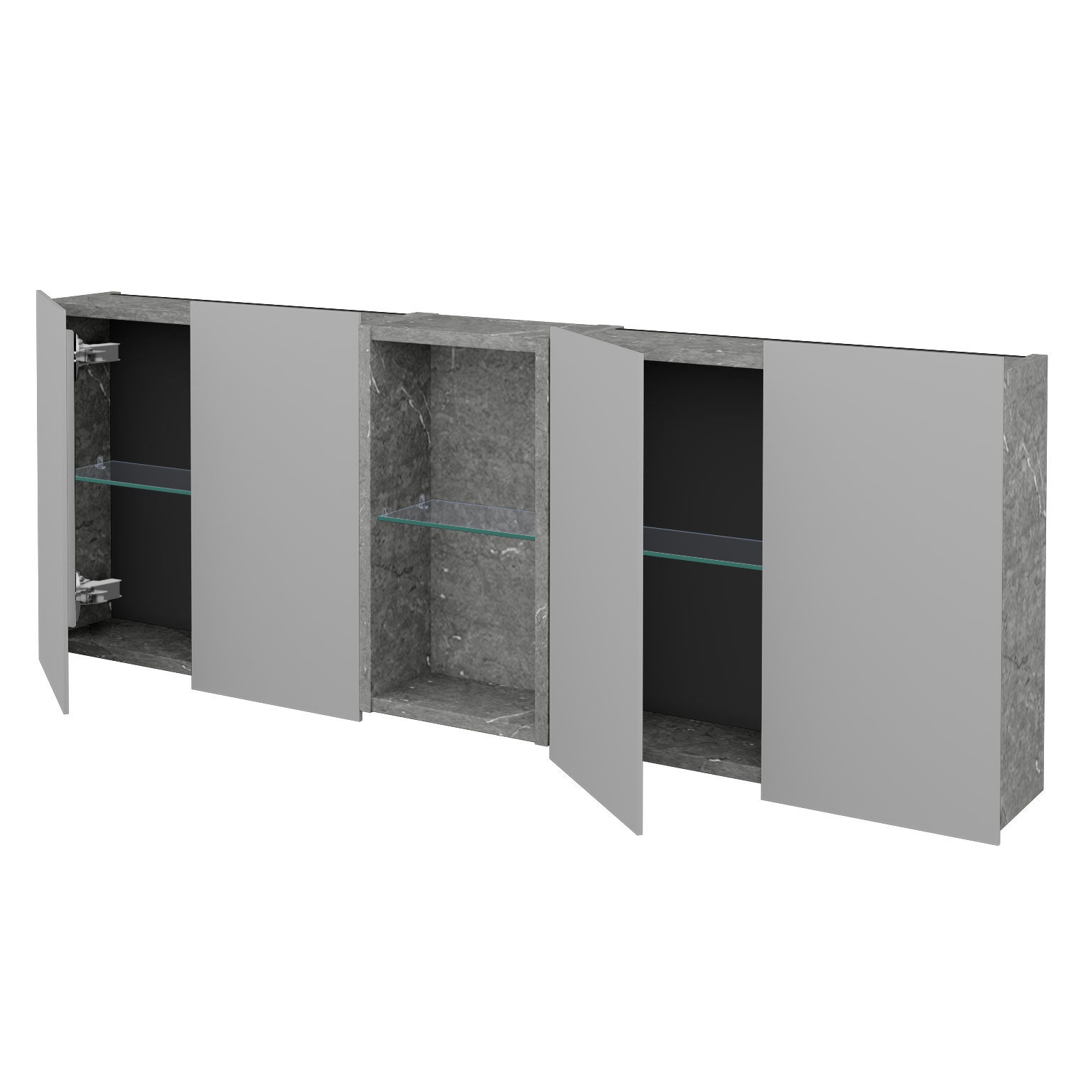 Po stranách niky nájdete priestor s obojstrannými zrkadlovými dvierkami, ktoré sa pohodlne otvárajú za spodný presah. Dvierka sú uchytené pomocou našej patentovanej lišty a osadené pántmi Hettich s tlmeným dovieraním, na ktoré výrobca poskytuje doživotnú záruku. V každej z troch častí je umiestnená jedna sklenená polica, takže usporiadanie je prehľadné a vyvážené. V uzavretých častiach sa navyše nachádza zásuvka a vypínač pre externé osvetlenie, pričom celé vyhotovenie spĺňa krytie IP44, takže je bezpečné aj v prostredí s vysokou vlhkosťou.