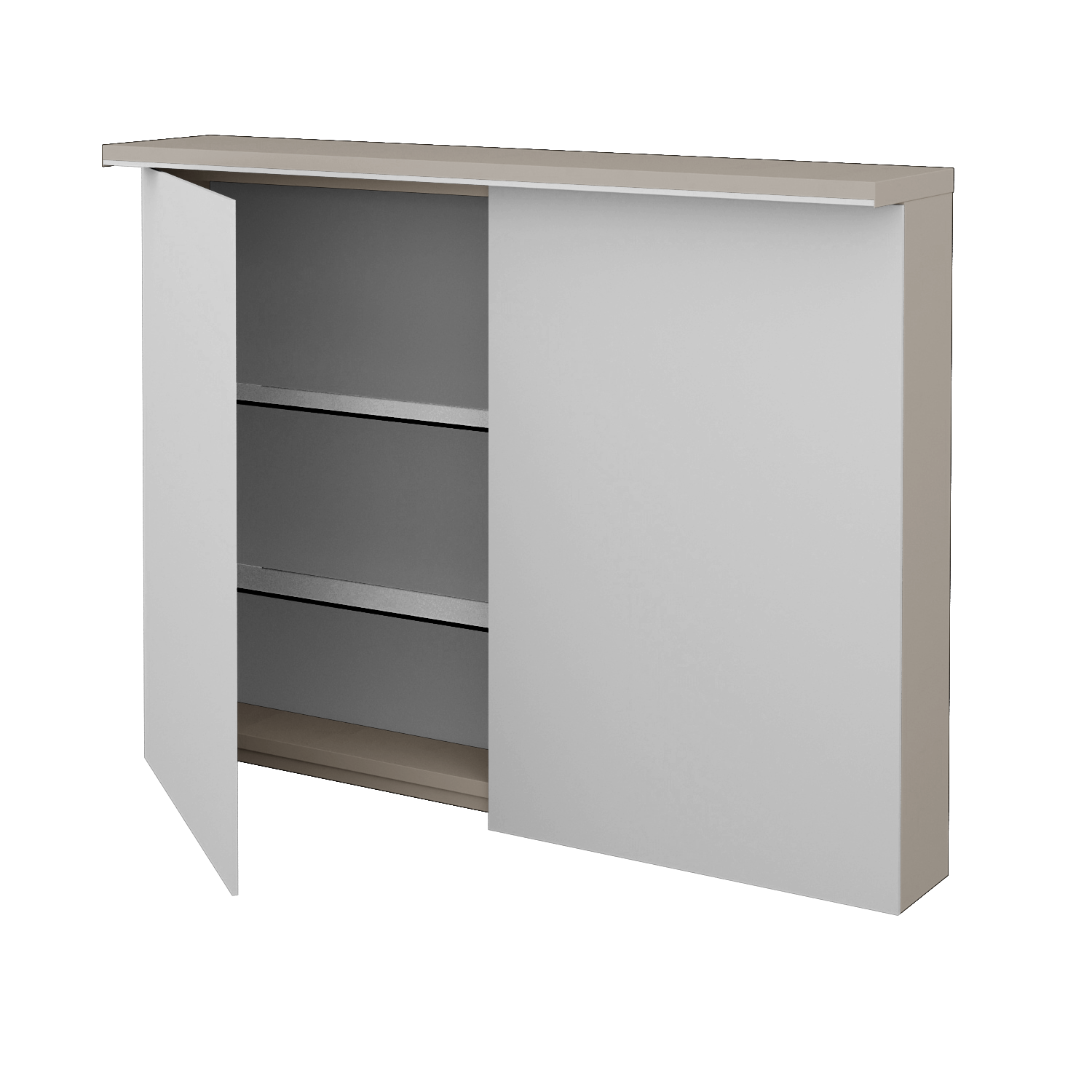 Dvojdverová zrkadlová skrinka ASTON GAO2E 100 vás na prvý pohľad prekvapí množstvom zrkadlovej plochy na obojstranne zrkadlových dvierkach, ktoré sú ku korpusu galérky pripevnené pomocou našej patentovanej lišty a kovania značky Hettich. Dvierka sa otvárajú v dolnej časti za presah, a vďaka značkovému kovaniu majú pohodlné a tlmené dovieranie.