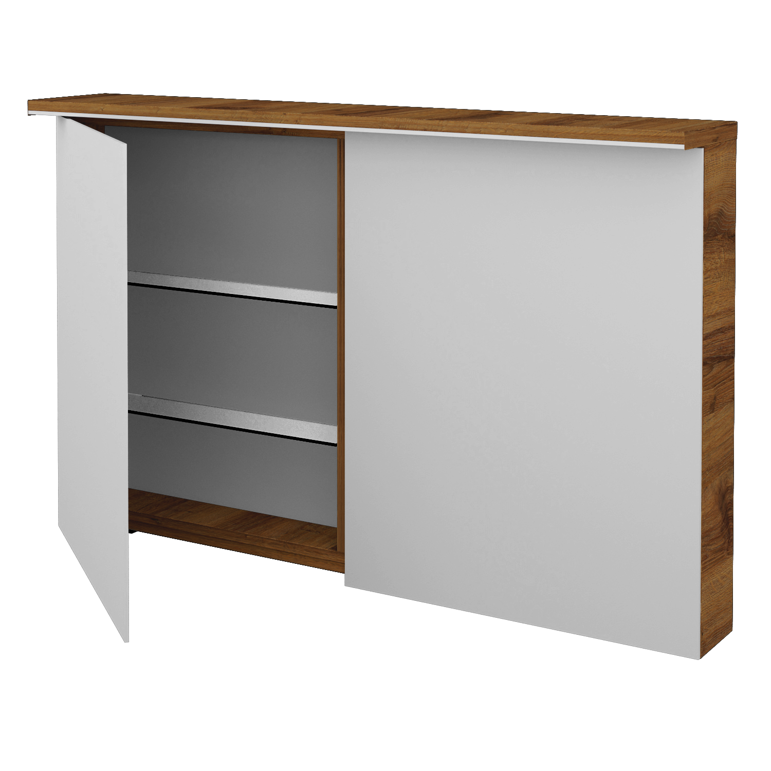 Dvojdverová zrkadlová skrinka ASTON GAO2E 120 vás na prvý pohľad prekvapí množstvom zrkadlovej plochy na obojstranne zrkadlových dvierkach, ktoré sú ku korpusu galérky pripevnené pomocou našej patentovanej lišty a kovania značky Hettich. Dvierka sa otvárajú v dolnej časti za presah, a vďaka značkovému kovaniu majú pohodlné a tlmené dovieranie.