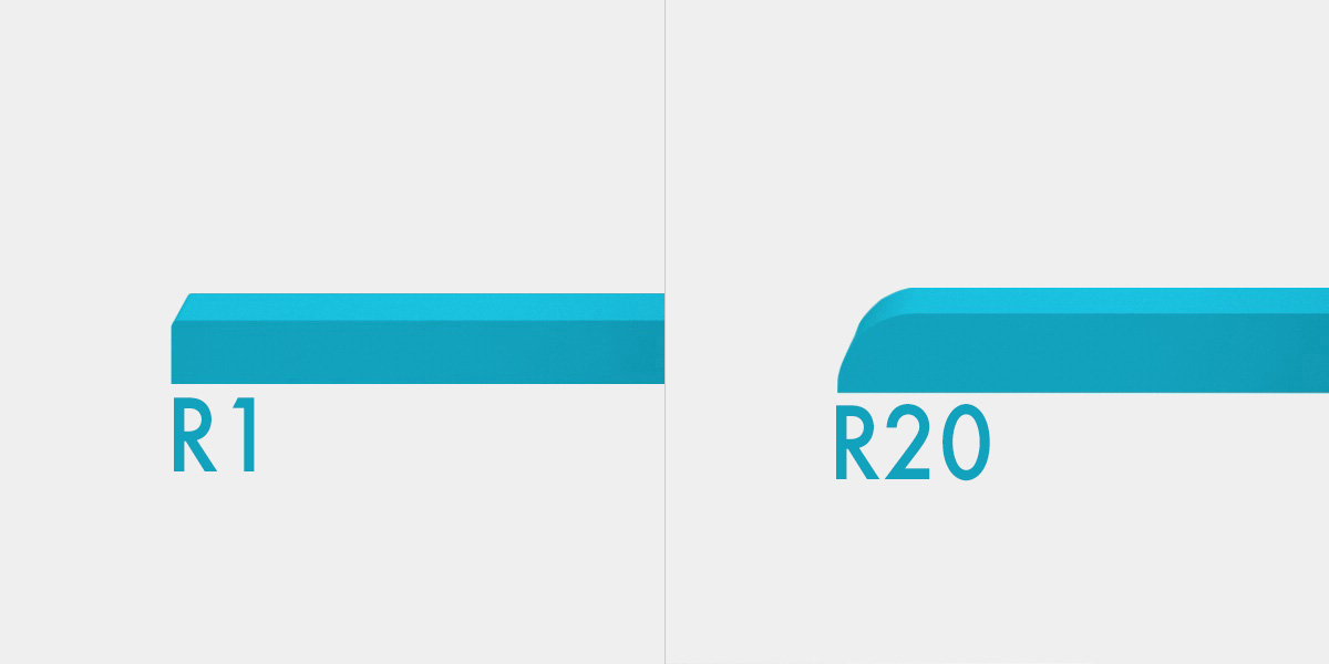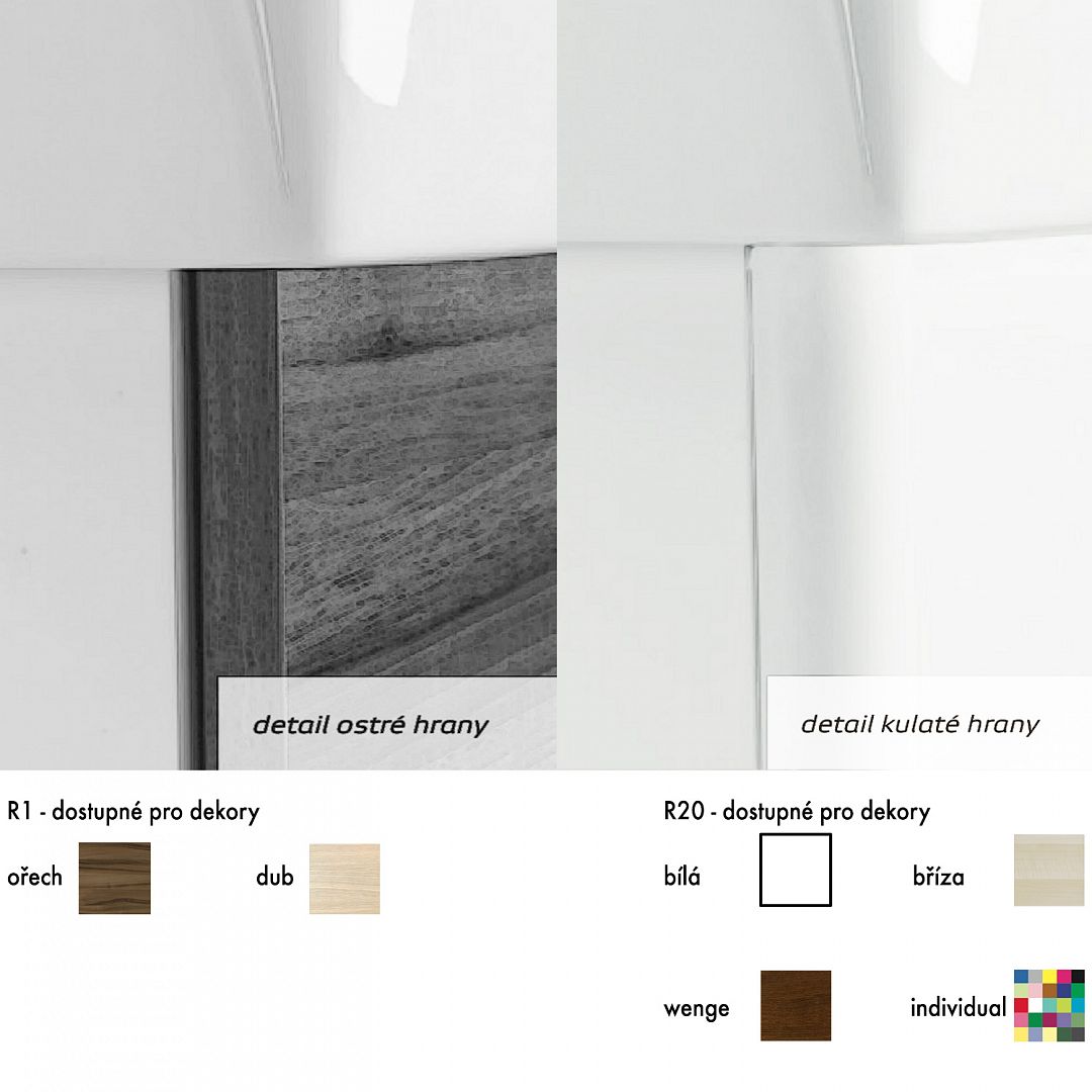 Čelní plochy v provedení bílá, bříza, wenge a individual mají zakulacené hrany (radius r20), v provedení dub a ořech mají hrany ostré (radius r1). Na rozdíl mezi radiusy se můžete podívat zde.