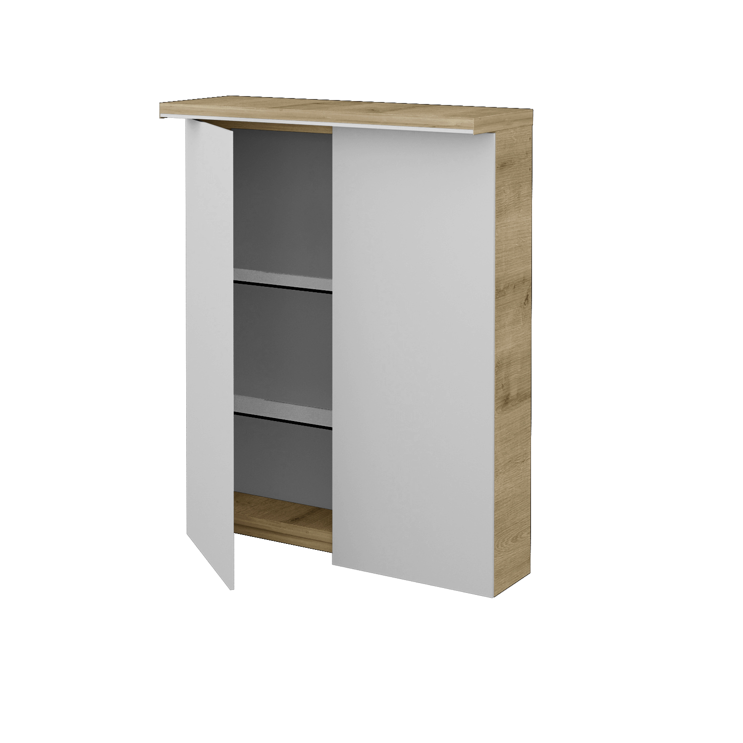 Dvojdverová zrkadlová skrinka ASTON GAO2E 60 vás na prvý pohľad prekvapí množstvom zrkadlovej plochy na obojstranne zrkadlových dvierkach, ktoré sú ku korpusu galérky pripevnené pomocou našej patentovanej lišty a kovania značky Hettich. Dvierka sa otvárajú v dolnej časti za presah, a vďaka značkovému kovaniu majú pohodlné a tlmené dovieranie.